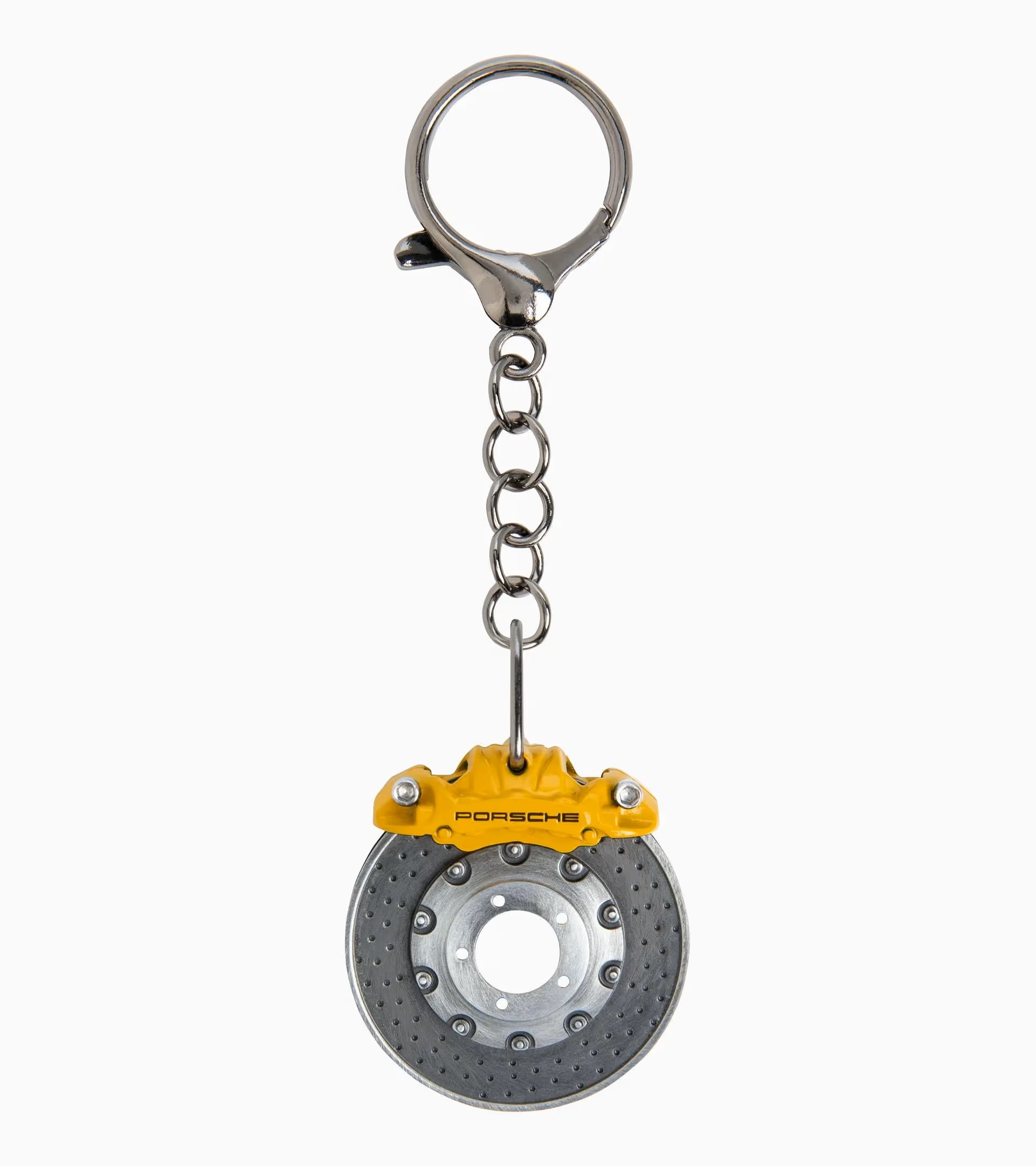 Chaveiro de qualidade com disco de freio Porsche giratório reproduzido fielmente.