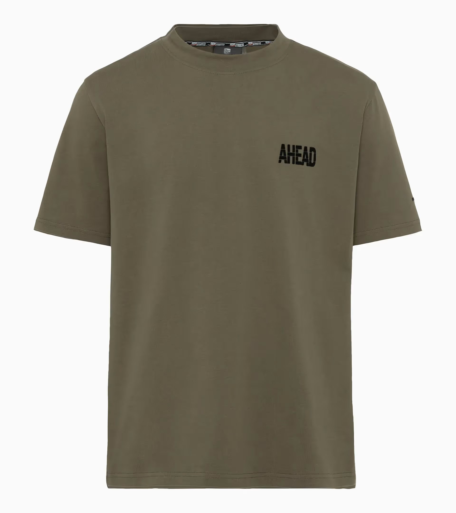 Viagem de carro encontra estilo de vida: a Coleção AHEAD combina espírito pioneiro e sede de aventura com design icônico. A camiseta, feita de algodão de alta qualidade, possui gola larga e modelagem levemente quadrada e solta. As inscrições "AHEAD" e "Porsche" no lado esquerdo do peito e na manga esquerda adicionam detalhes especiais. Uma estampa grande, que combina serigrafia e flocagem, nas costas completa o design.