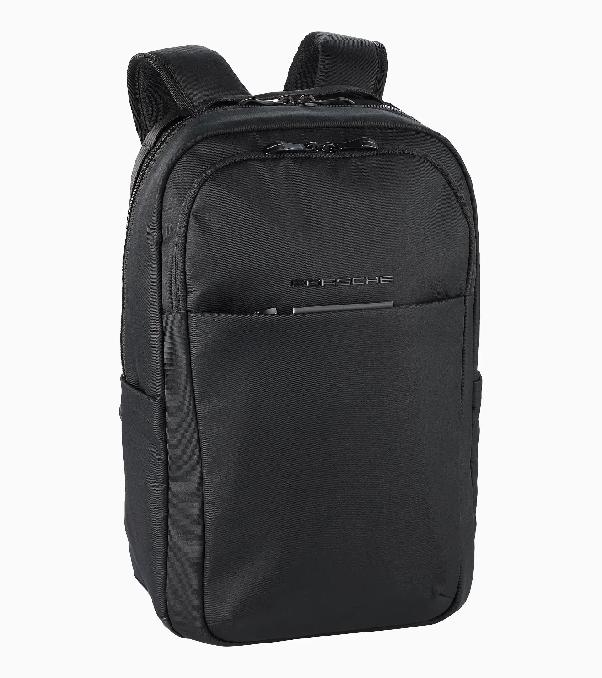 Mochila minimalista da Porsche feita de sarja reciclada. Especialmente leve e resistente à água. Com compartimento para laptops de até 15 polegadas.